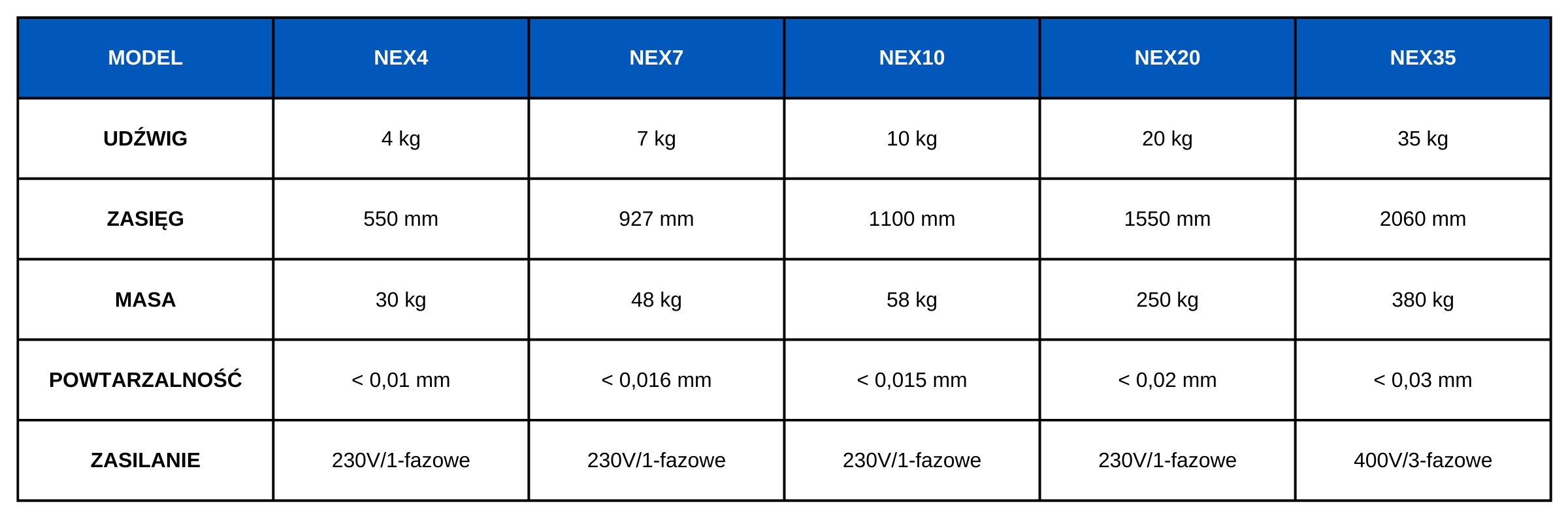 Seria MOTOMAN NEXT obejmuje pięć modeli różniących się udźwigiem: 4 kg, 7 kg, 10 kg, 20 kg oraz 35 kg.