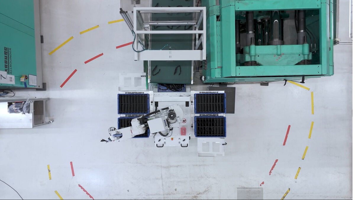 The base handling system from FMB used here is characterized by its consistent modularity. A standardized base module is equipped with an industrial robot suitable for the area of application. Various gripper and tool systems cover a wide range of applications, and standardized expansion and function modules allow the base to be adapted to specific processes. This means that the handling system can be quickly and economically tailored to the respective requirements. In addition, it can also be easily adapted or expanded for other processes for subsequent orders. A station system that ensures the energy supply makes the roller-mounted handling system mobile. In this way, it can be docked to additional stations and used to cover multiple processes at different locations and machines within the company with a single handling system. The "container feed" module used here provides storage areas for KLT containers directly on the handling system, into which the robot places the parts. The double gripper is precise and picks up two components at once. Since Chroff also produces parts on the same injection molding machine that can only be handled with a suction cup, the double gripper can be easily changed using a quick-change device.