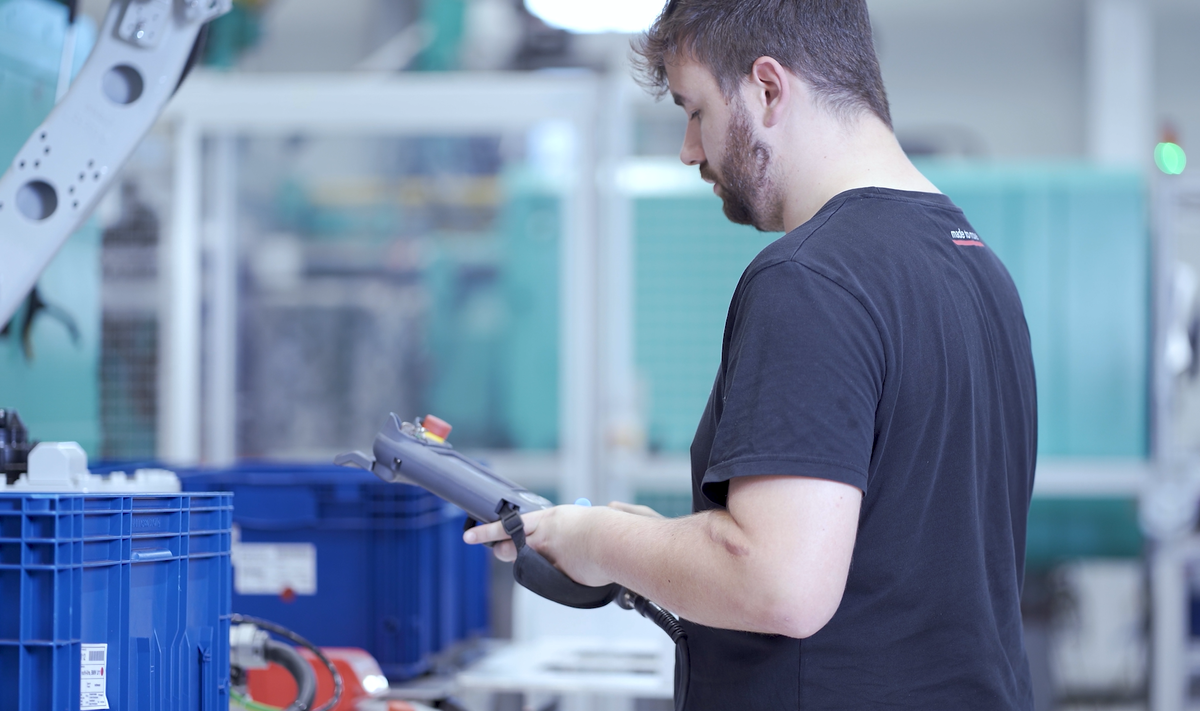 Possible applications include searching for production errors and recognizing text, codes, or colors. Here, the camera checks whether the component is right-handed or left-handed. This information is also sent to the robot. The components are then sorted reliably and correctly into the KLT containers. A Yaskawa GP12 is used for this purpose. With a payload of 12 kg and a reach of 1440 mm, the 6-axis industrial robot is perfectly suited for handling parts and is an established component in FMB's handling systems. FMB and Yaskawa have a long history together. FMB has been acting as a system integrator for Yaskawa industrial robots for 25 years. Over the years, the two companies have grown together. While the initial focus was primarily on loading and unloading tasks for industrial production, the spectrum is now much broader. Automation is in demand in all industries. Joining and assembly, packaging, measuring, labeling or, as in this case, removing and sorting complex injection-molded parts.
